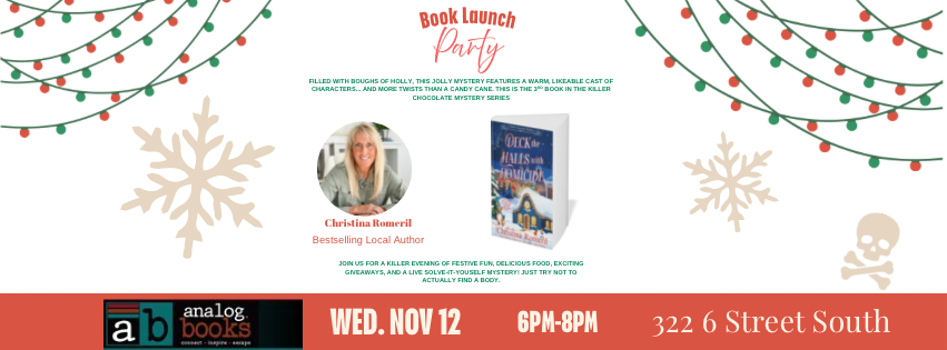 The next Killer Chocolate Mystery is here, and we’re having a book launch PARTY at Analog Books complete with FUN & GAMES!