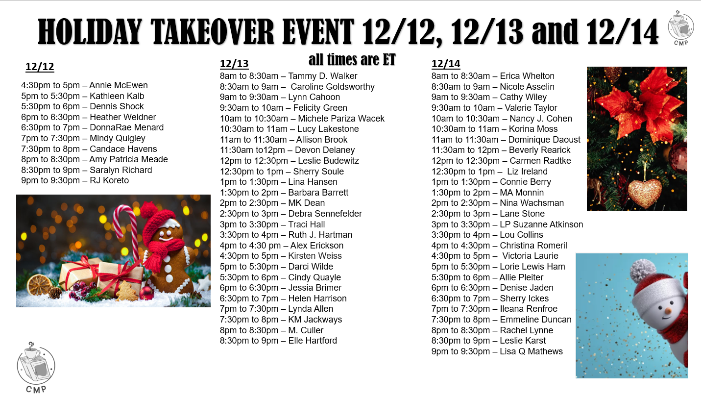Then at 6pm EST three of our authors will be doing a live. At 7pm EST four of our authors will be doing a live. And finally at 8pm EST our final three authors will be doing a live to close out the day. More details to come.